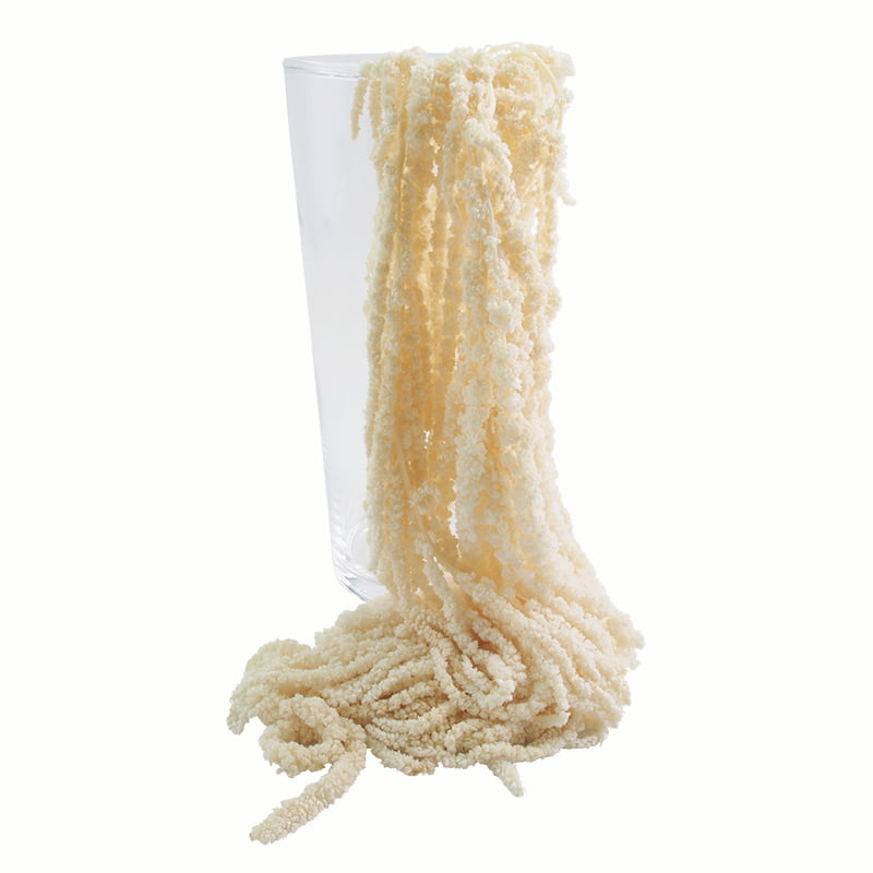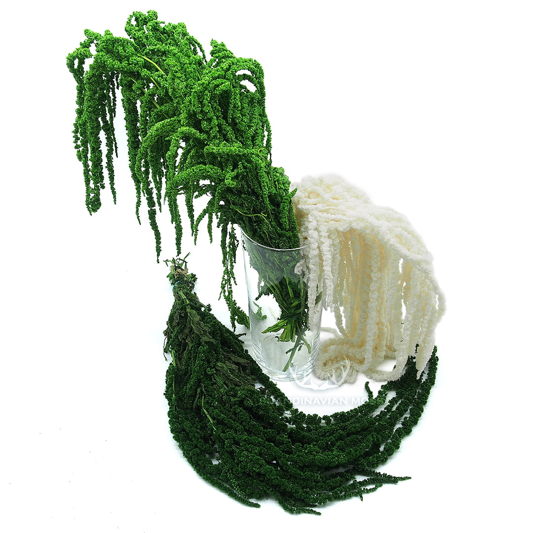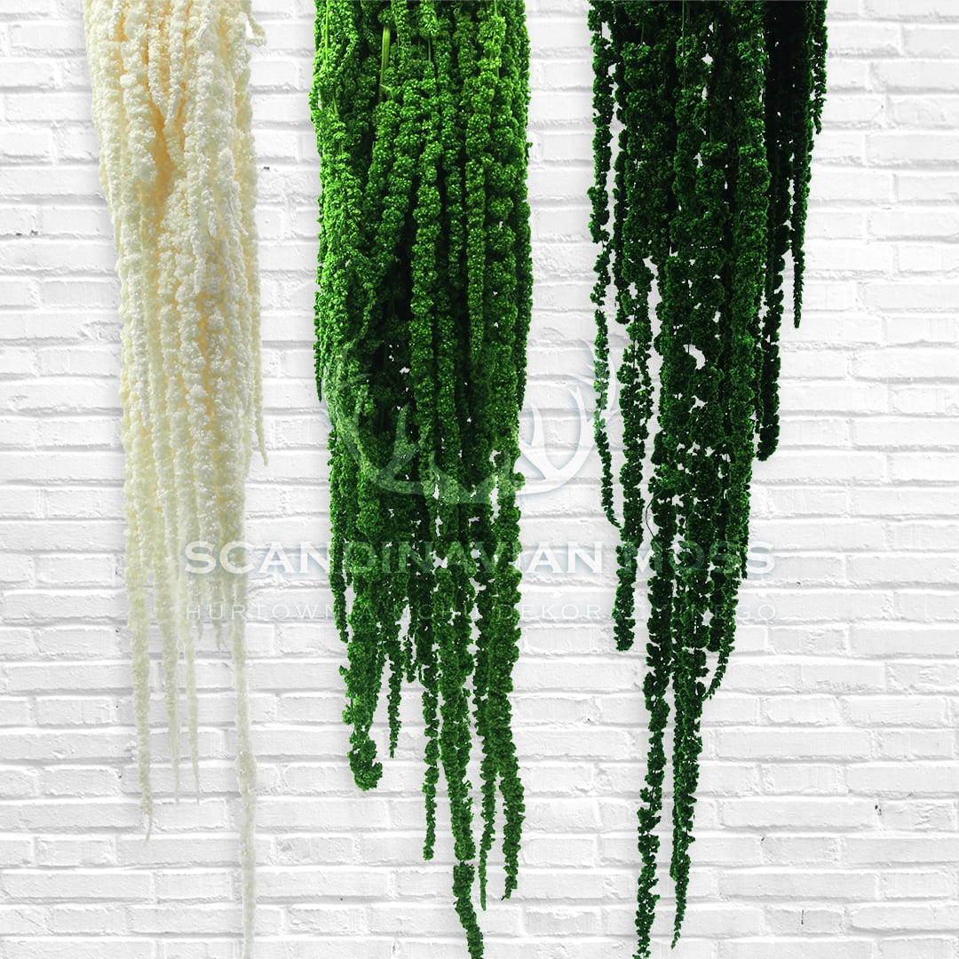 Gałązki amarantusa osiągają długość około 70 centymetrów. Każda gałązka posiada liczne zwisające kwiatostany, które swym wyglądem przypominają liny lub frędzle. Są miękkie i przyjemne w dotyku. Dostępny w sklepie Scandinavian Moss amarantus stabilizowany ma kolor złamanej bieli.