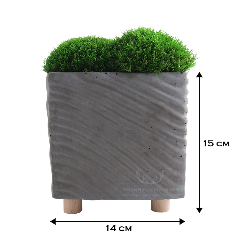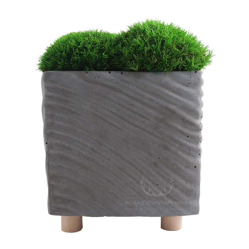 Mech poduszkowy użyty w kompozycji posiada intrygującą, niejednolitą fakturę. Występuje pod postacią zaokrąglonych, trójwymiarowych poduszek. Poszczególne kępki mchu różnią się wielkością i wysokością, co dodaje kompozycji walorów estetycznych. Średniozielony mech efektownie kontrastuje z szarym kolorem doniczki. Jego odcień, uzyskany naturalnymi barwnikami, przywodzi na myśl barwę prawdziwego runa leśnego.