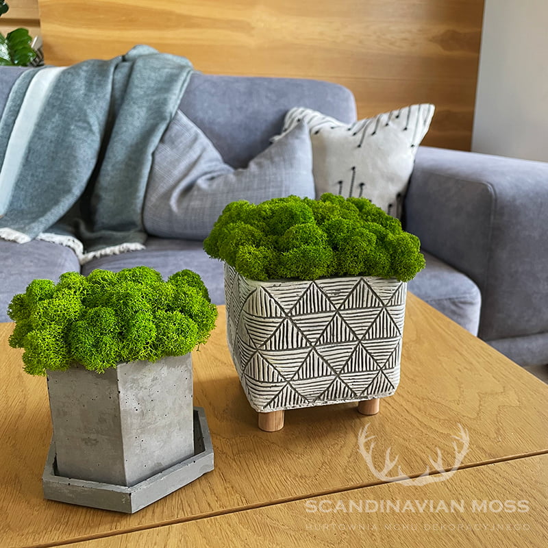 Donica z mchem chrobotkiem to designerska ozdoba, którą możesz umieścić w niemal dowolnym pomieszczeniu. Świetnie będzie prezentować się w sypialni, pokoju dziecięcym lub salonie. Ponieważ mech stabilizowany nie potrzebuje dostępu do światła słonecznego, kompozycję można ustawić także w łazience, kuchni, przedpokoju lub innej zacienionej przestrzeni.