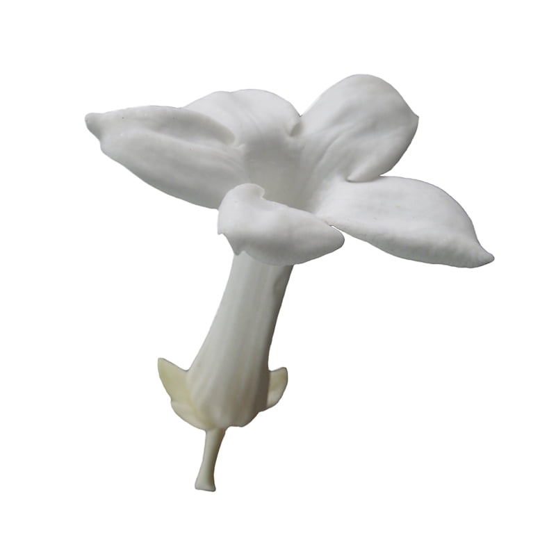 Dostępny w ofercie jaśmin stabilizowany posiada delikatne, białe kwiaty o kształcie przypominającym gwiazdę. Każdy kwiat ma pięć sztywnych, lekko wygiętych płatków. Charakterystyczne dla jaśminu są długie rurki, z której wyrastają kwiaty. Ich śnieżnobiała barwa sprawia, że roślina prezentuje się wyjątkowo urokliwie.