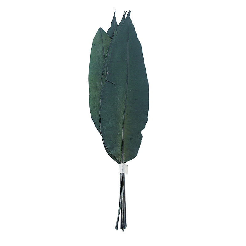 Tropikalne liście stabilizowane to ciekawy element dekoracyjny nawiązujący do modnych ostatnio motywów egzotycznych. Osadzony na sztywnej łodydze liść ma podłużny kształt i gładkie krawędzie. Roślina posiada głęboki odcień butelkowej zieleni. Powierzchnia liści jest matowa z jednej strony, a z drugiej delikatnie błyszcząca z wyraźną, prążkowaną fakturą.