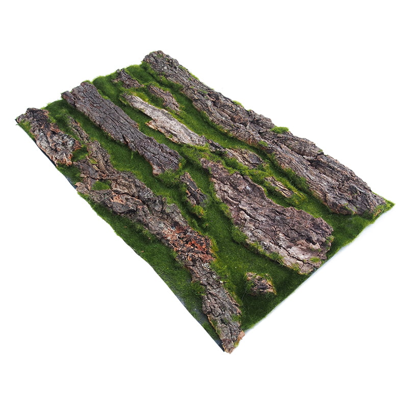 Prostokątna mata ze sztucznej kory i mchu o wymiarach ok. 30×50 centymetrów. Mata wykonana z cienkiej, elastycznej pianki. Jedna strona pokryta została syntetycznym mchem w jasnym odcieniu zieleni i kawałkami kory z tworzywa sztucznego, które do złudzenia przypominają swoje naturalne odpowiedniki. Nieregularna powierzchnia nadaje ozdobie autentycznego wyglądu. Podłoże jest giętkie i podatne na kształtowanie, dlatego możliwy jest montaż na powierzchniach płaskich, wypukłych, wklęsłych i półokrągłych.