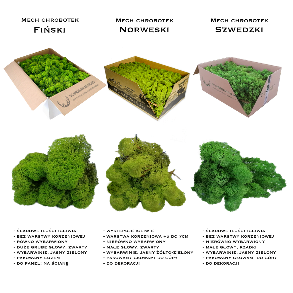 Mech chrobotek polarny zbierany jest w lasach Szwecji. Jest to 100% naturalny produkt. Mech jest oczyszczony i zawiera śladowe zanieczyszczenia w postaci igliwia. Produkt został trwale zaimpregnowany, a swój zielony kolor uzyskał w wyniku barwienia naturalnymi barwnikami.