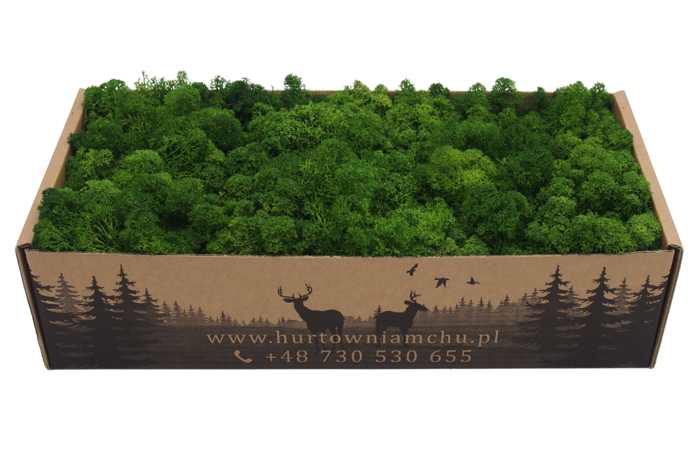 Chrobotek dark green (ciemnozielony) pochodzący z leśnych terenów Islandii. To produkt nieoczyszczony, co oznacza, że znajduje się w nim igliwie oraz pozostałości leśnej ściółki. Mech islandzki polecany jest przede wszystkim jako naturalny element dekoracji sezonowych, kompozycji florystycznych, stroików i wieńców. Chrobotek stabilizowany przez wiele lat zachowuje swój pierwotny kolor i strukturę. Produkt w 100% naturalnego pochodzenia. Materiał dekoratorski o wysokości od 5 do 7 cm, pakowany luzem. Pojedynczy karton 500 g wystarcza na pokrycie ok. 0,1 m².