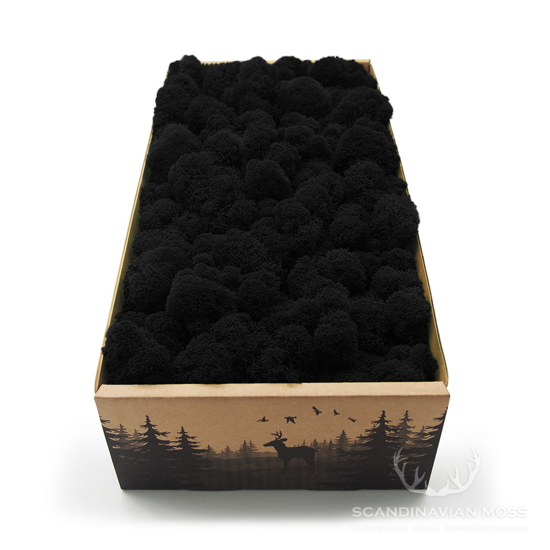 Stabilizowany naturalny chrobotek w kolorze czarnym (black) pochodzący z leśnych terenów Finlandii. To mech oczyszczony, co oznacza, że znajdują się w nim śladowe ilości igliwia. Za jego pomocą możesz tworzyć zielone ściany z mchu, obrazy roślinne i inne kompozycje florystyczne. Stabilizowany mech reniferowy przez wiele lat zachowuje swój pierwotny kolor i strukturę. W 100% naturalnego pochodzenia. Materiał dekoratorski o wysokości od 4 do 8 cm, pakowany luzem. Pojedynczy karton 500 g wystarcza na pokrycie powierzchni około 35 x 30 cm.