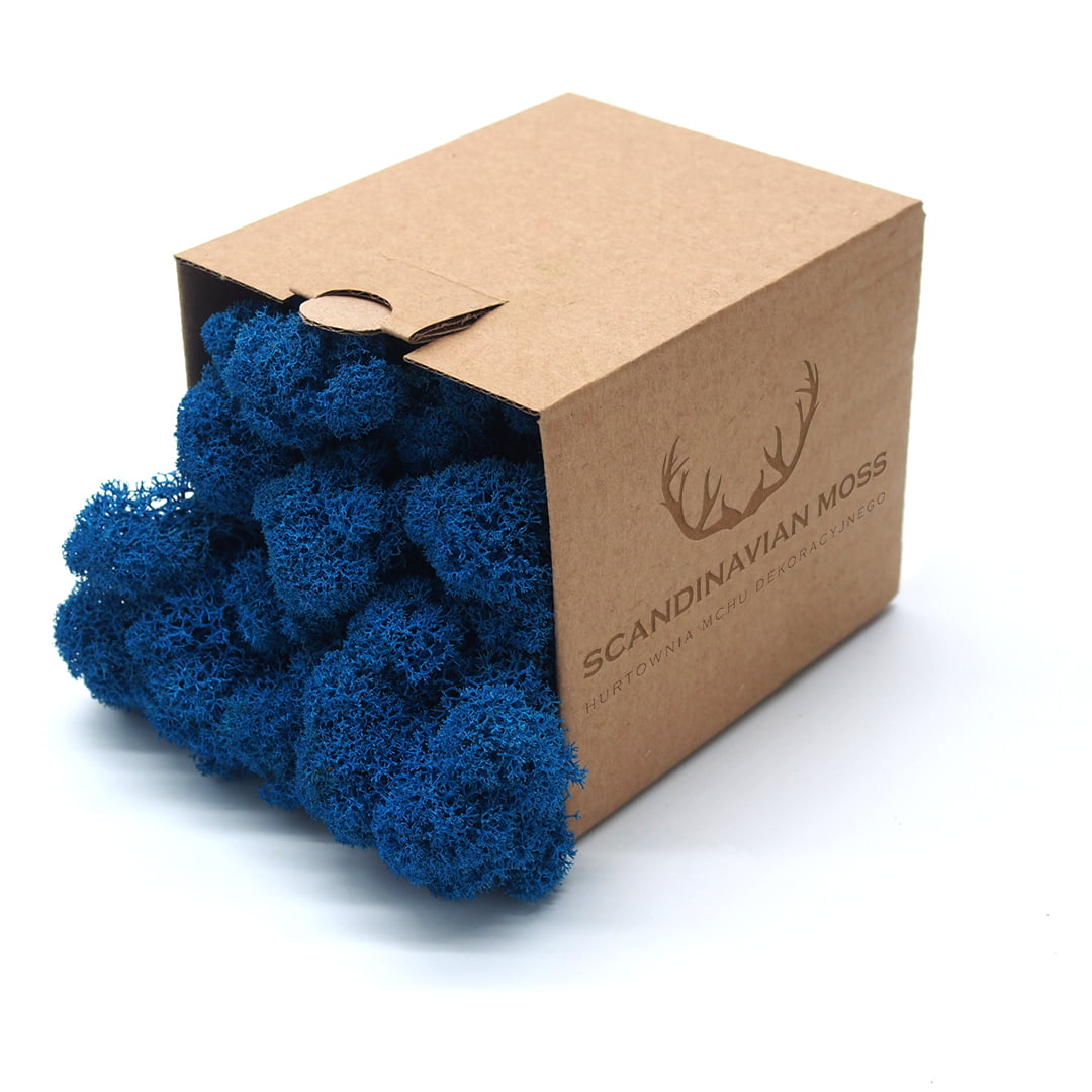Stabilizowany chrobotek reniferowy w kolorze niebieskim (blue) pochodzący z leśnych terenów Finlandii. Mech chrobotek oczyszczony posiada śladowe ilości igliwia. Za jego pomocą możesz tworzyć zielone ściany z mchu, obrazy roślinne i inne kompozycje florystyczne. Mech fiński stabilizowany przez wiele lat zachowuje swój pierwotny kolor i strukturę. W 100% naturalnego pochodzenia. Materiał dekoratorski o wysokości od 4 do 8 cm, pakowany luzem.