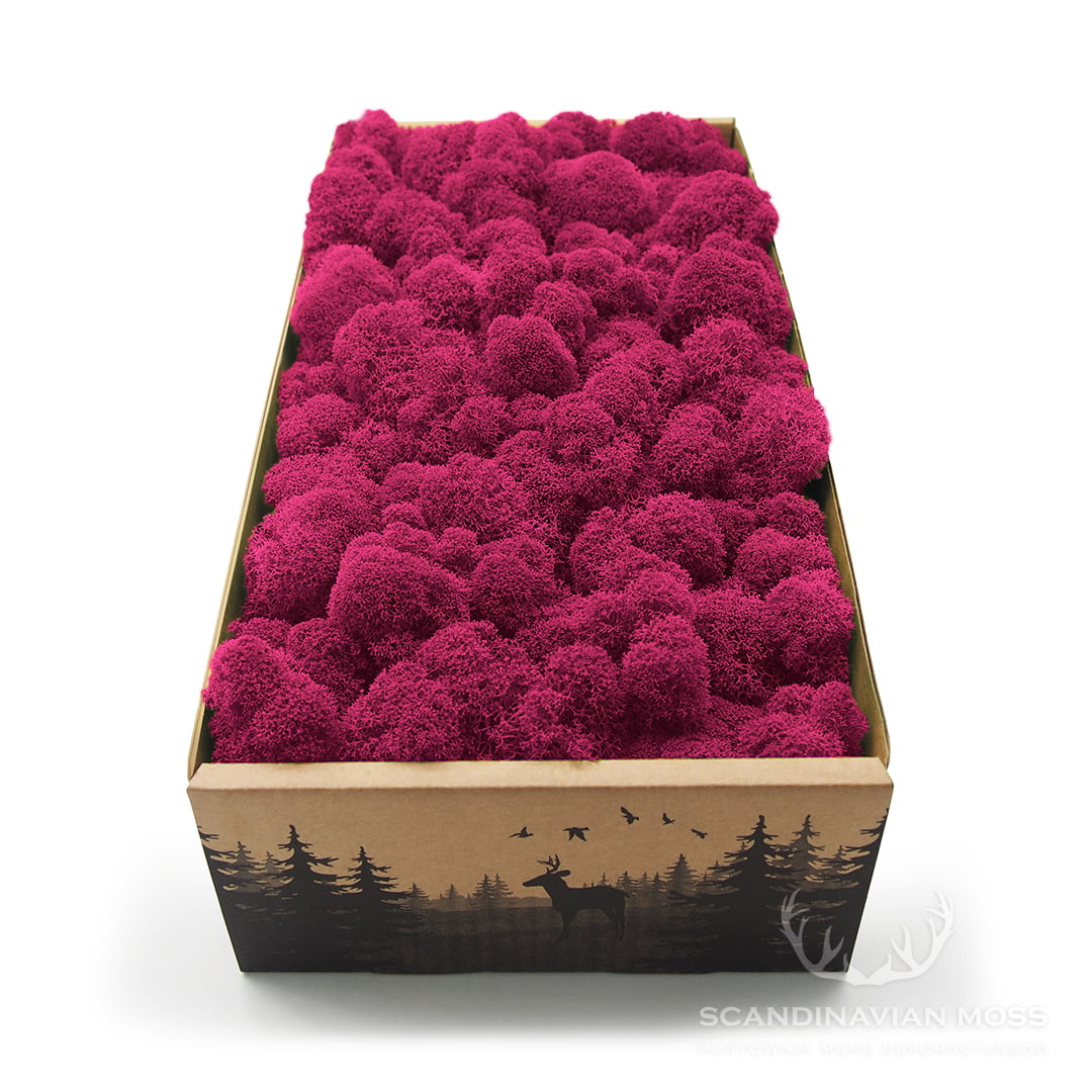 Preparowany naturalny chrobotek w kolorze fuksji (fuchsia) pochodzący z leśnych terenów Finlandii. To mech oczyszczony, co oznacza, że znajdują się w nim śladowe ilości igliwia. Za jego pomocą możesz tworzyć zielone ściany z mchu, obrazy roślinne i inne kompozycje florystyczne. Mech chrobotek stabilizowany przez wiele lat zachowuje swój pierwotny kolor i strukturę. W 100% naturalnego pochodzenia. Materiał dekoratorski o wysokości od 4 do 8 cm, pakowany luzem. Pojedynczy karton 500 g wystarcza na pokrycie powierzchni około 35 x 30 cm.