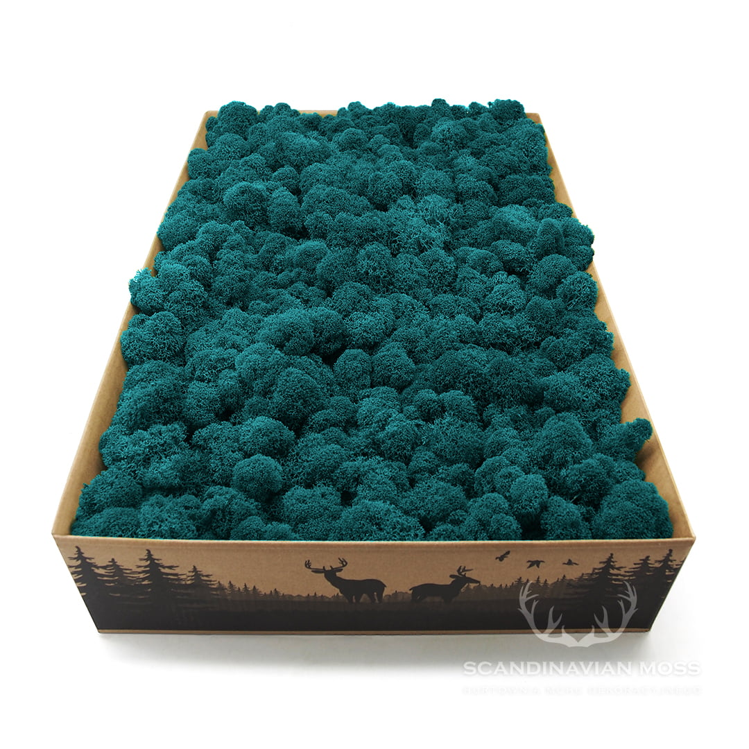 Stabilizowany chrobotek w kolorze morskim (marine) pochodzący z leśnych terenów Finlandii. To produkt oczyszczony, co oznacza, że znajdują się w nim śladowe ilości igliwia. Za jego pomocą możesz tworzyć zielone ściany z mchu, obrazy roślinne i inne kompozycje florystyczne. Mech Scandinavian Moss przez wiele lat zachowuje swój pierwotny kolor i strukturę. W 100% naturalnego pochodzenia. Materiał dekoratorski o wysokości od 4 do 8 cm, pakowany luzem. Pojedynczy karton 2 kg wystarcza na pokrycie ok. 0,35 m².