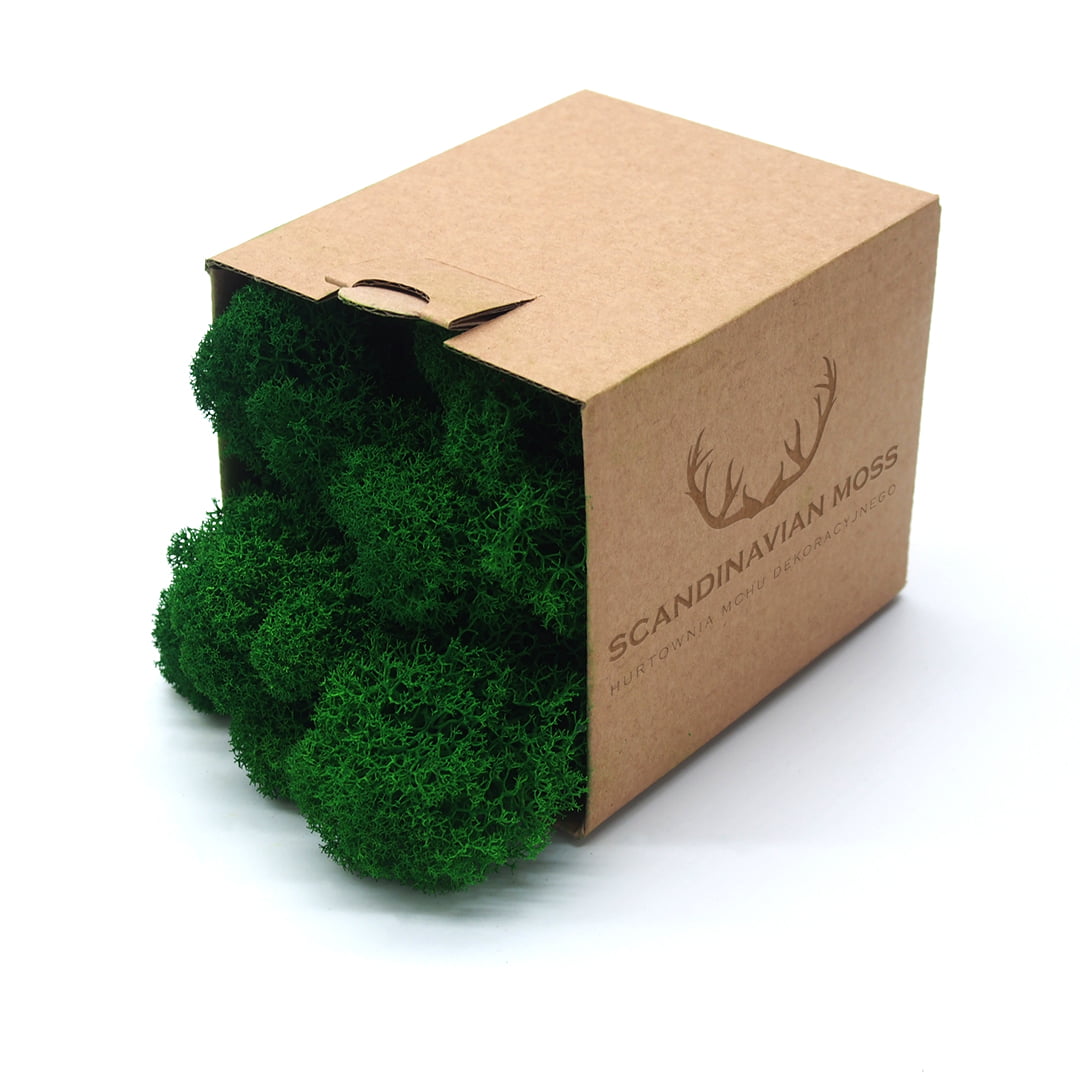 Chrobotek reniferowy w kolorze zielonym jabłkowym (apple medium green) pochodzący z leśnych terenów Finlandii. To produkt oczyszczony, dlatego posiada śladowe ilości igliwia. Za jego pomocą możesz tworzyć zielone ściany z mchu, obrazy roślinne i inne kompozycje florystyczne. Stabilizowany mech zielony przez wiele lat zachowuje swój pierwotny kolor i strukturę. W 100% naturalnego pochodzenia. Materiał dekoratorski o wysokości od 4 do 8 cm, pakowany luzem.