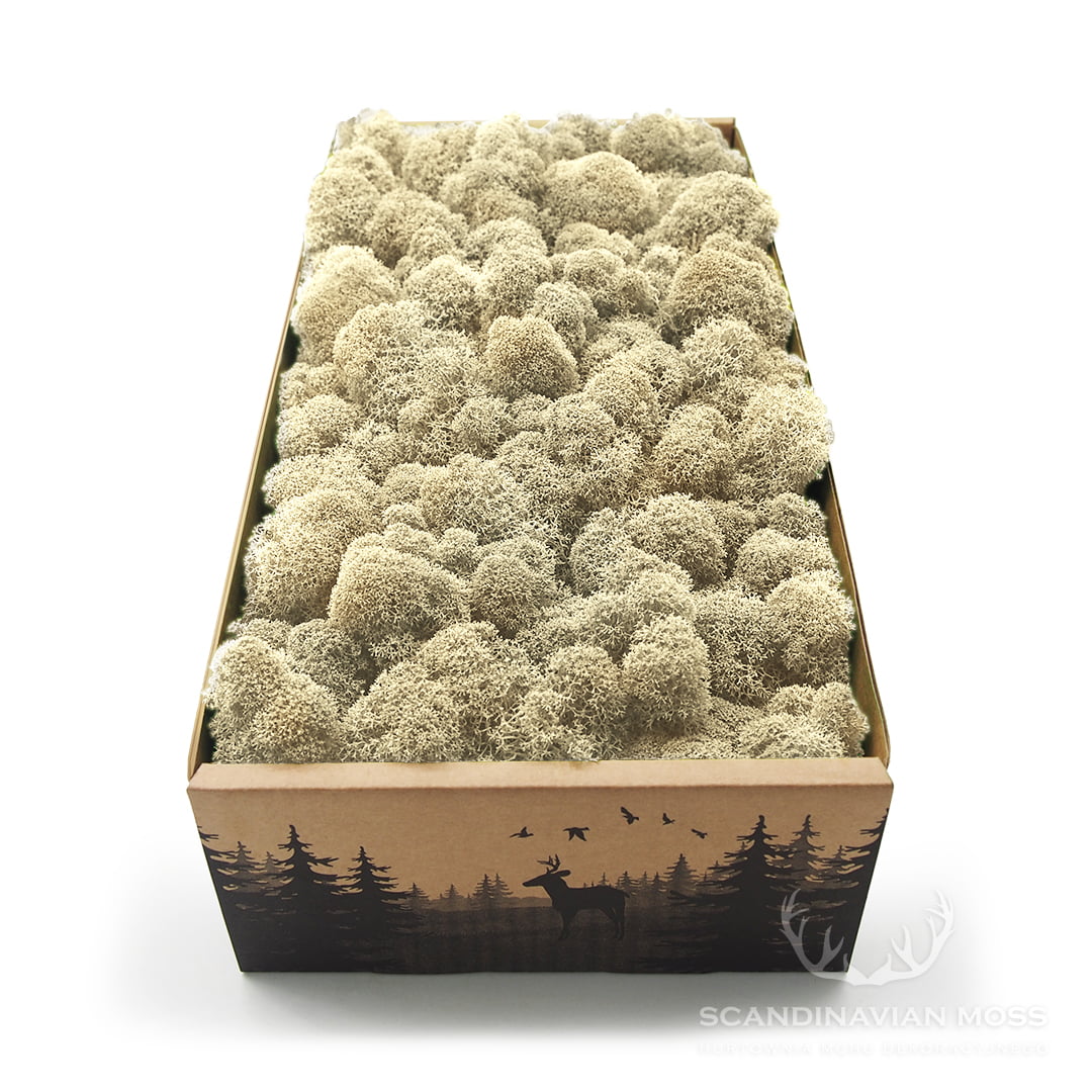 Stabilizowany chrobotek w naturalnym, kremowobiałym kolorze (natural moss) pochodzący z leśnych terenów Finlandii. To mech oczyszczony, co oznacza, że znajdują się w nim śladowe ilości igliwia. Za jego pomocą możesz tworzyć zielone ściany z mchu, obrazy roślinne i inne kompozycje florystyczne. Stabilizowany mech reniferowy przez wiele lat zachowuje swój pierwotny kolor i strukturę. W 100% naturalnego pochodzenia. Materiał dekoratorski o wysokości od 4 do 8 cm, pakowany luzem. Pojedynczy karton 500 g wystarcza na pokrycie powierzchni około 35 x 30 cm.
