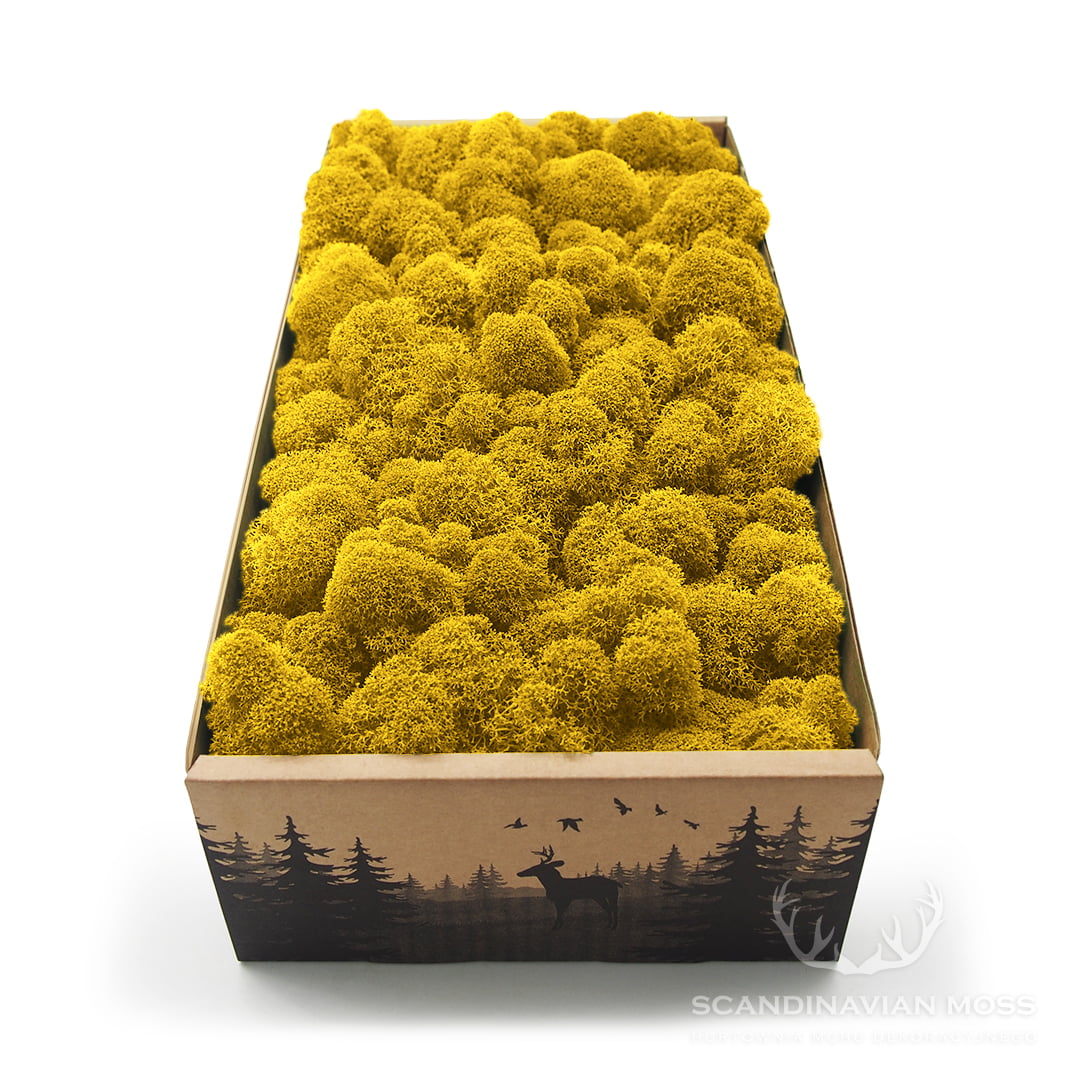 Preparowany naturalny chrobotek w kolorze żółtym (yellow) pochodzący z leśnych terenów Finlandii. To mech oczyszczony, co oznacza, że znajdują się w nim śladowe ilości igliwia. Za jego pomocą możesz tworzyć zielone ściany z mchu, obrazy roślinne i inne kompozycje florystyczne. Stabilizowany chrobotek Scandinavian Moss przez wiele lat zachowuje swój pierwotny kolor i strukturę. W 100% naturalnego pochodzenia. Materiał dekoratorski o wysokości od 4 do 8 cm, pakowany luzem. Pojedynczy karton 500 g wystarcza na pokrycie powierzchni około 35 x 30 cm.