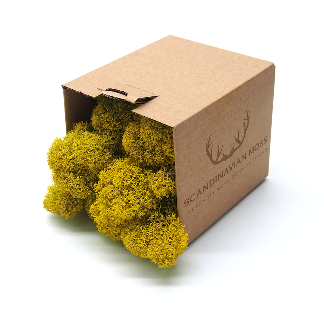 Chrobotek reniferowy preparowany w kolorze żółtym (yellow) pochodzący z leśnych terenów Finlandii. Mech chrobotek oczyszczony posiada śladowe ilości igliwia. Za jego pomocą możesz tworzyć zielone ściany z mchu, obrazy roślinne i inne kompozycje florystyczne. Mech stabilizowany przez wiele lat zachowuje swój pierwotny kolor i strukturę. W 100% naturalnego pochodzenia. Materiał dekoratorski o wysokości od 4 do 8 cm, pakowany luzem.