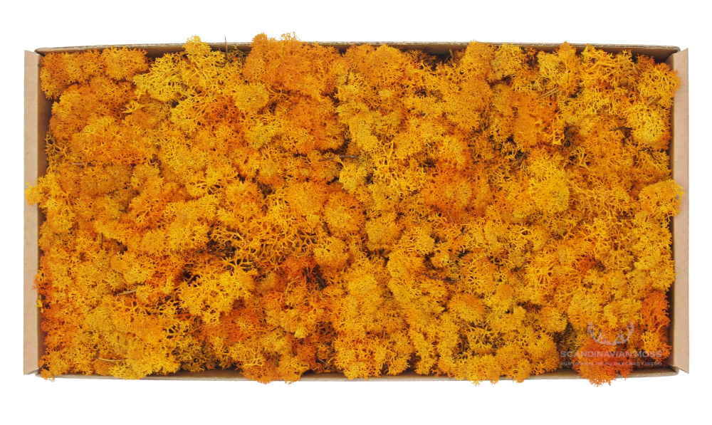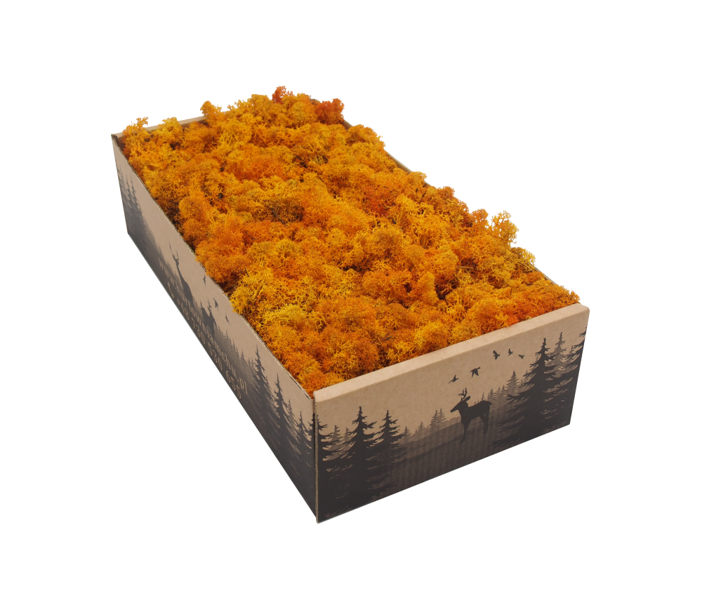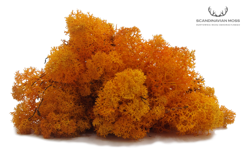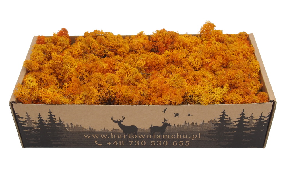 Chrobotek stabilizowany reniferowy w kolorze pomarańczowym (orange) pochodzący z leśnych terenów Islandii. To produkt nieoczyszczony, co oznacza, że znajduje się w nim igliwie oraz pozostałości leśnej ściółki. Chrobotek islandzki polecany jest przede wszystkim jako naturalny element dekoracji sezonowych, kompozycji florystycznych, stroików i wieńców. Mech został ustabilizowany, dlatego przez wiele lat zachowuje swój pierwotny kolor i strukturę. Produkt w 100% naturalnego pochodzenia. Materiał dekoratorski o wysokości od 5 do 7 cm, pakowany luzem. Pojedynczy karton 500 g wystarcza na pokrycie ok. 30 x 35 cm.