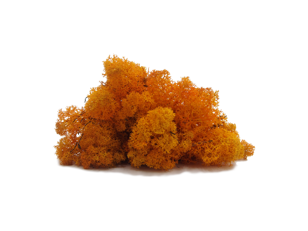 Mech chrobotek islandzki w kolorze pomarańczowym (orange). To produkt nieoczyszczony, co oznacza, że znajduje się w nim igliwie oraz pozostałości leśnej ściółki. Chrobotek islandzki stosuje się przede wszystkim jako naturalny element dekoracji sezonowych, kompozycji florystycznych, stroików i wieńców. Mech stabilizowany przez wiele lat zachowuje swój pierwotny kolor i strukturę. Produkt w 100% naturalnego pochodzenia. Materiał dekoratorski o wysokości od 5 do 7 cm, pakowany luzem.