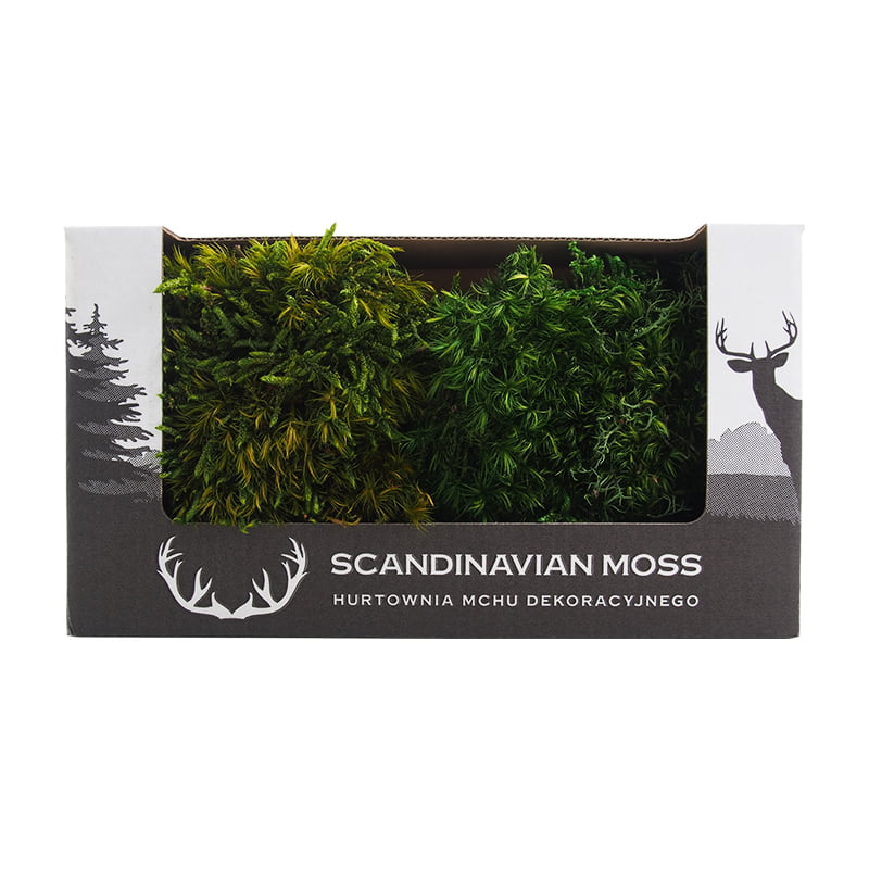 Produkt zabarwiono na intensywniejsze kolory w odcieniu jasnej i ciemnej zieleni. Jego barwa jest identyczna z tą, którą posiada leśne runo. Naturalne ubarwienie mchu zależy od kąta padania promieni słonecznych, dlatego jest nierównomierne. Podobnie mech prowansalski Scandinavian Moss ma niejednolitą barwę, co dodaje mu walorów wizualnych.