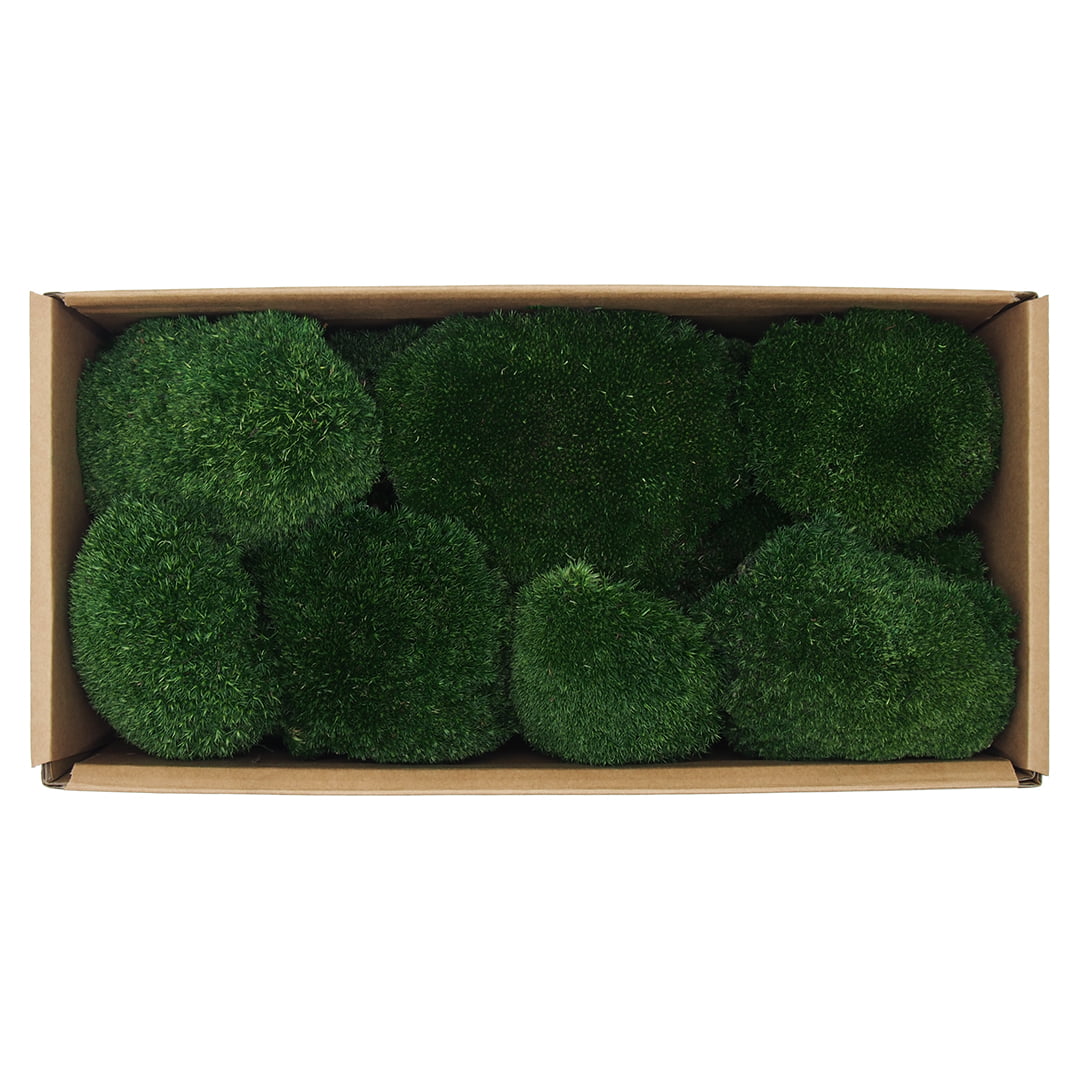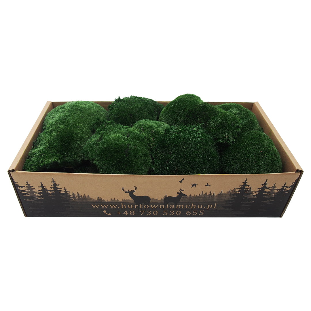 Preparowany mech poduszkowy ciemny zielony pochodzący z terenów Skandynawii. Jego inne popularne nazwy to: mech okrągły, gąbczasty, mech kulisty (ball moss, pole moss). Najczęściej stosowany przy tworzeniu zielonych ścian i obrazów roślinnych. Mech stabilizowany przez wiele lat zachowuje swój pierwotny kolor i strukturę. W 100% naturalnego pochodzenia. Materiał dekoratorski o wysokości od 2 do 6 cm, pakowany warstwowo. Pojedynczy karton wystarcza na pokrycie powierzchni ok. 30×35 cm (~0,1 m²).