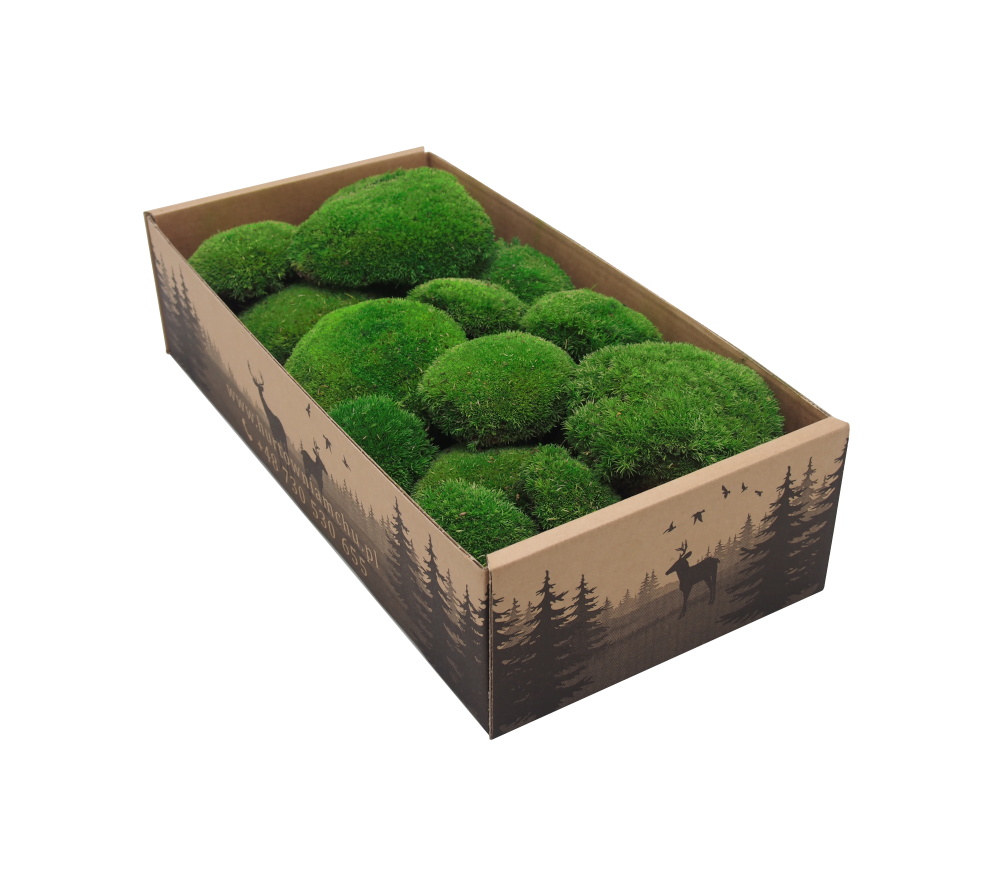Preparowany mech poduszkowy średni zielony pochodzący z terenów Szwecji. Jego inne popularne nazwy to: mech okrągły, gąbczasty, mech kulisty (ball moss, pole moss). Najczęściej stosowany przy tworzeniu zielonych ścian i obrazów roślinnych. Mech stabilizowany przez wiele lat zachowuje swój pierwotny kolor i strukturę. W 100% naturalnego pochodzenia. Materiał dekoratorski o wysokości od 2 do 6 cm, pakowany warstwowo. Pojedynczy karton wystarcza na pokrycie powierzchni ok. 33×33 cm (~0,1 m²) – taka sama pow. krycia jak przy 200g poduszki nieobcinanej warstwy korzeniowej