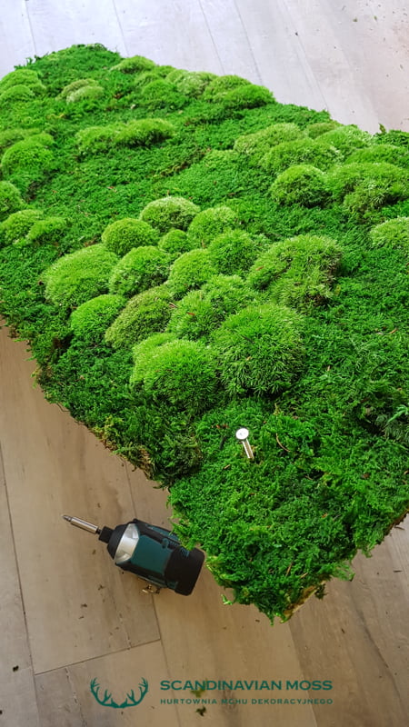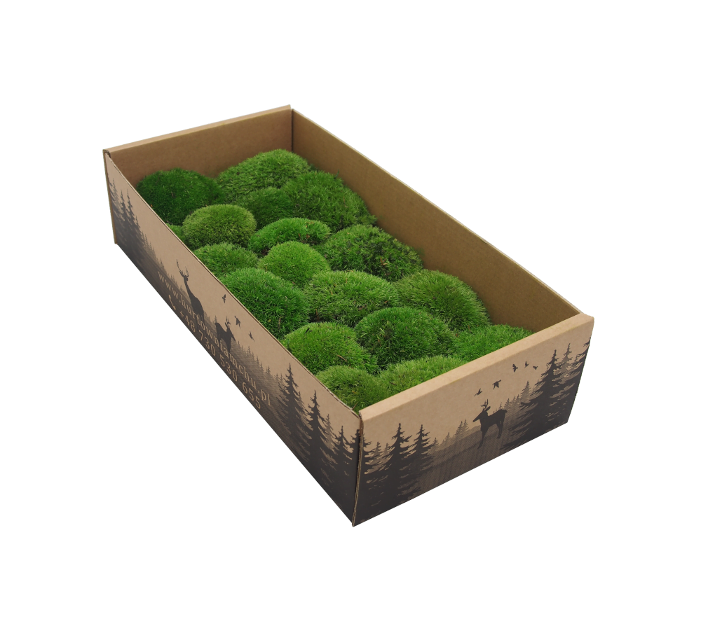 Preparowany mech poduszkowy średni zielony pochodzący z Turcji. Jego inne popularne nazwy to: mech okrągły, gąbczasty, mech kulisty (ball moss, pole moss). Najczęściej stosowany przy tworzeniu zielonych ścian i obrazów roślinnych. Mech stabilizowany przez wiele lat zachowuje swój pierwotny kolor i strukturę. W 100% naturalnego pochodzenia. Materiał dekoratorski o wysokości od 2 do 6 cm, pakowany warstwowo. Pojedynczy karton wystarcza na pokrycie powierzchni ok. 30×35 cm (~0,1 m²).