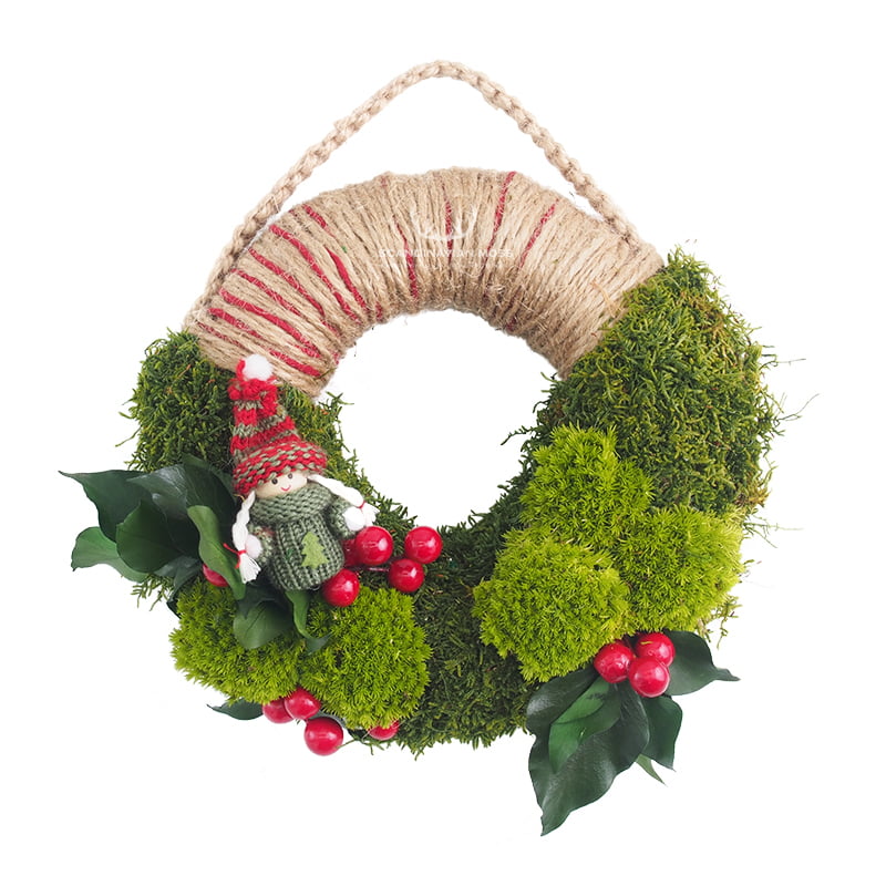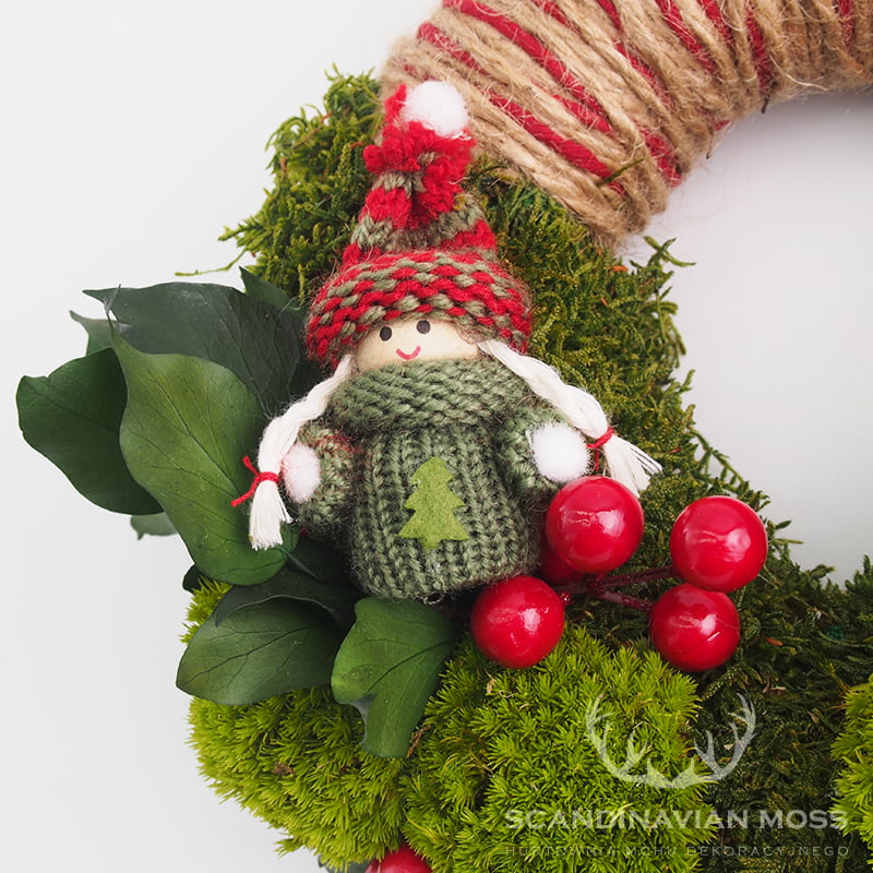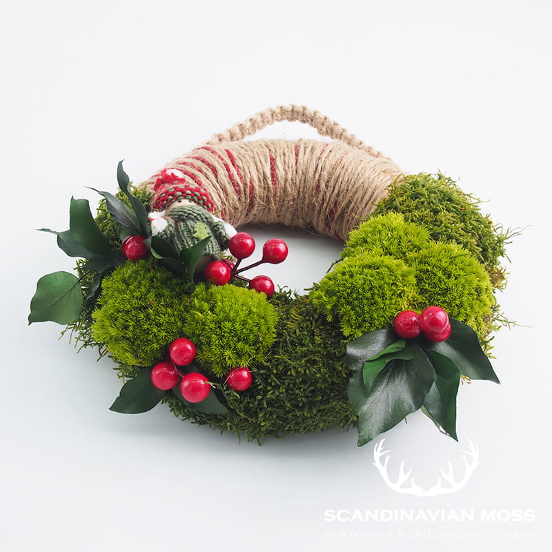 Naturalny wianek bożonarodzeniowy z mikołajkiem 20 cm z naturalnym mchem i roślinami stabilizowanymi to własnoręcznie wykonana dekoracja. Idealnie sprawdzi się jako świąteczna ozdoba wnętrza, do zawieszenia na ścianie lub drzwiach.