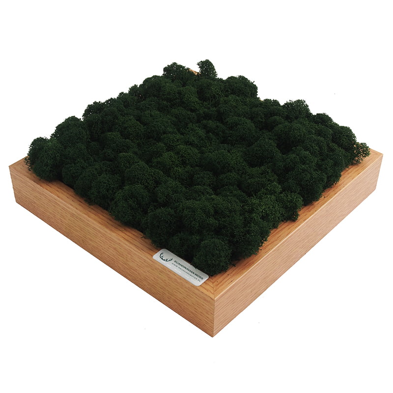 Ręcznie robiony obrazek z chrobotka reniferowego w solidnej ramie dębowej o wymiarach 25 x 25 centymetrów. Ramka posiada zawieszkę, dlatego możesz powiesić ją na ścianie jako oryginalną dekorację o naturalnym charakterze. Obraz nie wymaga podlewania, pielęgnacji ani nasłonecznienia. Ozdoba z mchu stabilizowanego ożywi każde wnętrze i doda namiastkę lasu w mieszkaniu, domu czy biurze.