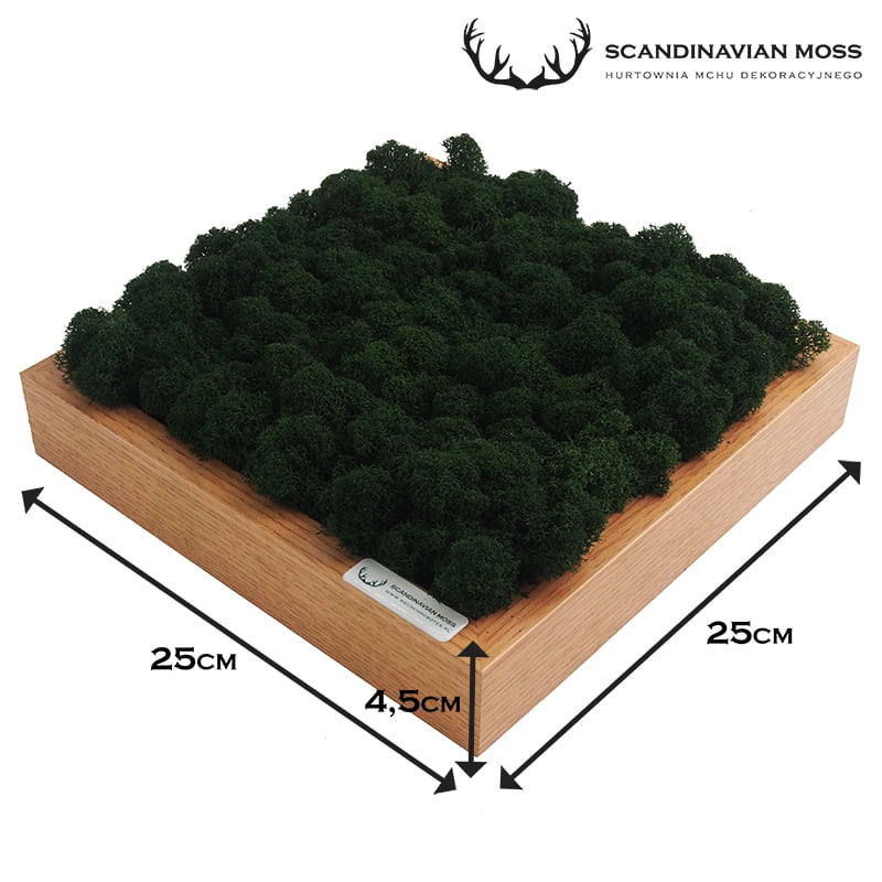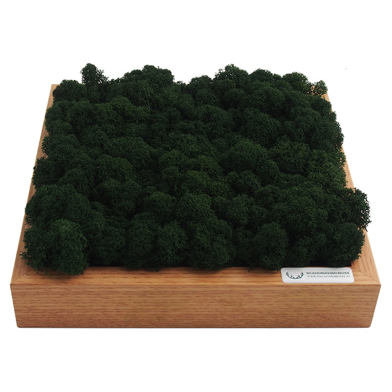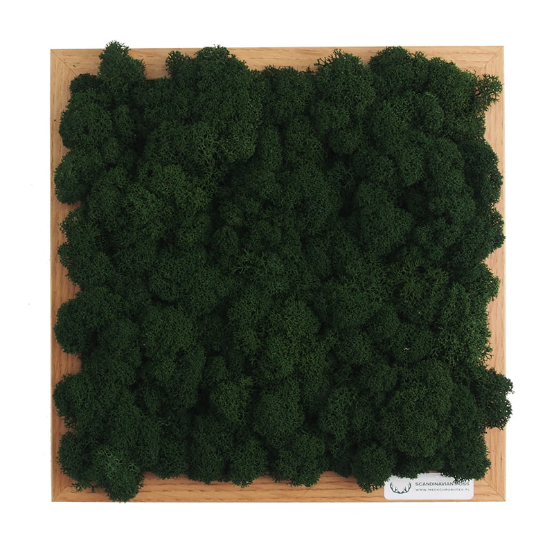 Obraz umieszczono w jasnobrązowej ramce dębowej wymiarach 25 x 25 centymetrów. Stanowi nowoczesną dekorację wnętrza. Ciemnozielony, głęboki kolor chrobotka efektownie kontrastuje z jasnobrązowym odcieniem ramy, tworząc nieoczywistą kompozycję, od której ciężko oderwać wzrok. Starannie wyselekcjonowane kępki chrobotka na stałe umieszczono w ramie. Ciasno do siebie przylegają, tworząc miękką w dotyku, sprężystą powierzchnię o wysokości około 7 centymetrów. Poszczególne główki porostu delikatnie różnią się zabarwieniem, co dodaje kompozycji walorów estetycznych.
