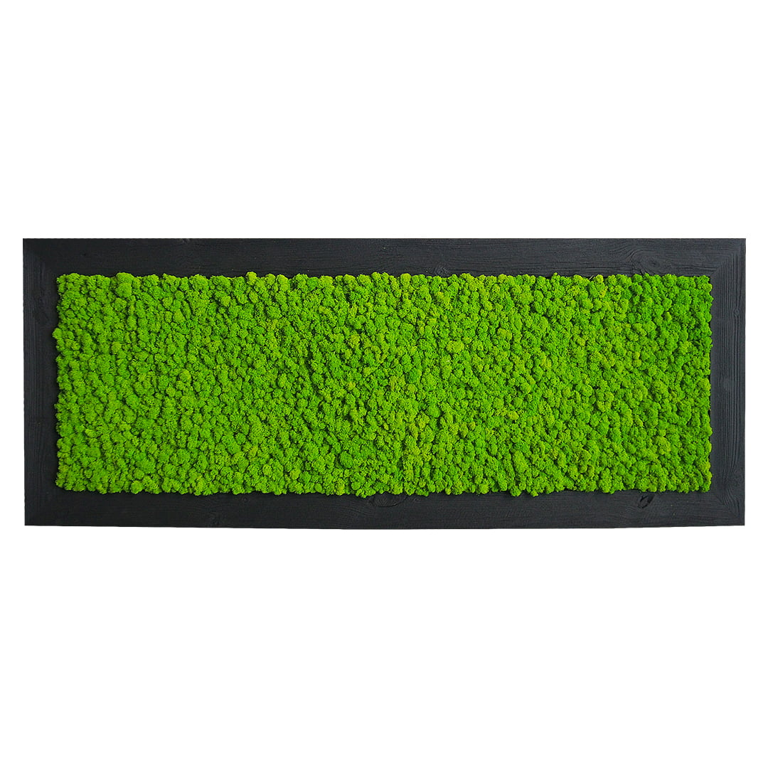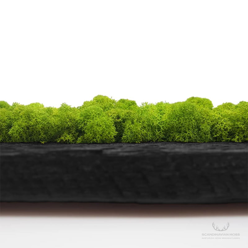 Obraz umieszczono w efektownej ramie ze starego drewna o wymiarach wskazanych przez klienta. Energetyczny, jasnozielony kolor chrobotka efektownie kontrastuje z czarnym kolorem ramy, tworząc nieoczywistą kompozycję, od której ciężko oderwać wzrok. Starannie wyselekcjonowane kępki chrobotka na stałe umieszczono w ramie. Ciasno do siebie przylegają, tworząc miękką w dotyku, sprężystą powierzchnię. Poszczególne główki porostu mają odmienną wysokość i delikatnie różnią się zabarwieniem, co dodaje kompozycji walorów estetycznych.