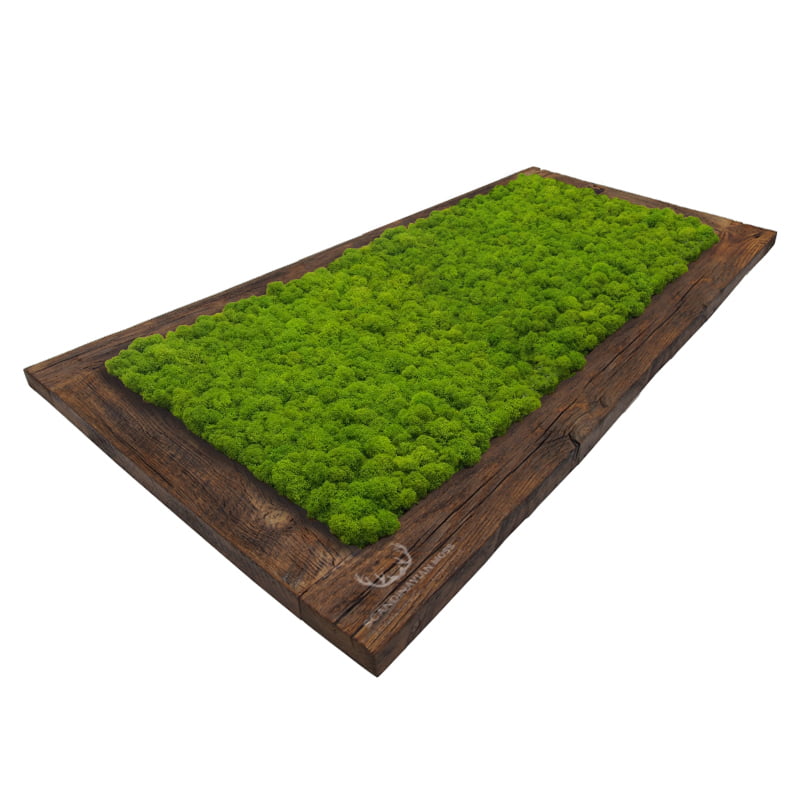 Ręcznie robiony obraz ramie ze starego drewna wykonany z chrobotka reniferowego jakości premium w kolorze jasnej zieleni. Obraz tworzony według wskazanych wymiarów. Nie wymaga podlewania, pielęgnacji ani nasłonecznienia. Ozdoba z mchu stabilizowanego ożywi każde wnętrze i doda namiastkę lasu w mieszkaniu, domu czy biurze.
