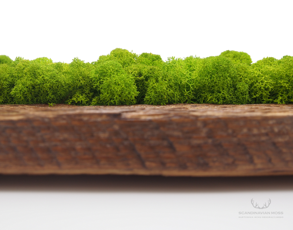 Obraz umieszczono w efektownej ramie ze starego drewna o wymiarach wskazanych przez klienta. Energetyczny, jasnozielony kolor chrobotka efektownie kontrastuje z naturalnym, brązowym kolorem ramy, tworząc nieoczywistą kompozycję, od której ciężko oderwać wzrok. Starannie wyselekcjonowane kępki chrobotka na stałe umieszczono w ramie. Ciasno do siebie przylegają, tworząc miękką w dotyku, sprężystą powierzchnię. Poszczególne główki porostu mają odmienną wysokość i delikatnie różnią się zabarwieniem, co dodaje kompozycji walorów estetycznych.