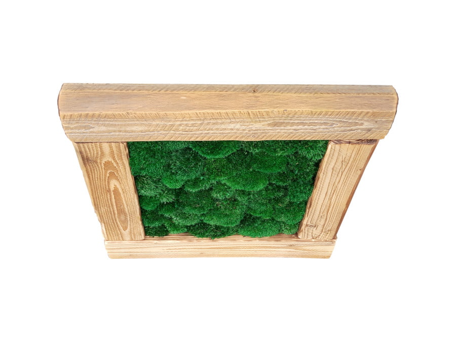 Obraz z mchu poduszkowego ciemnego wykonany jest w ramie ze starego drewna, ramie niezwykłej i niedostępnej dla każdego stolarza. Stare drewno jest materiałem ekskluzywnym i drogim. Do obrazów użyty został oryginalny Mech od Scandinavian Reindeer Moss jakości Premium (1 i 2 klasa).