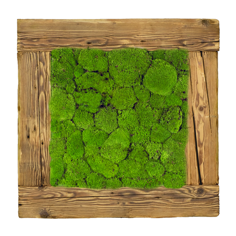 Obraz z mchu poduszkowego ciemnego wykonany jest w ramie ze starego drewna, ramie niezwykłej i niedostępnej dla każdego stolarza. Stare drewno jest materiałem ekskluzywnym i drogim. Do obrazów użyty został oryginalny Mech od Scandinavian Reindeer Moss jakości Premium (1 i 2 klasa).