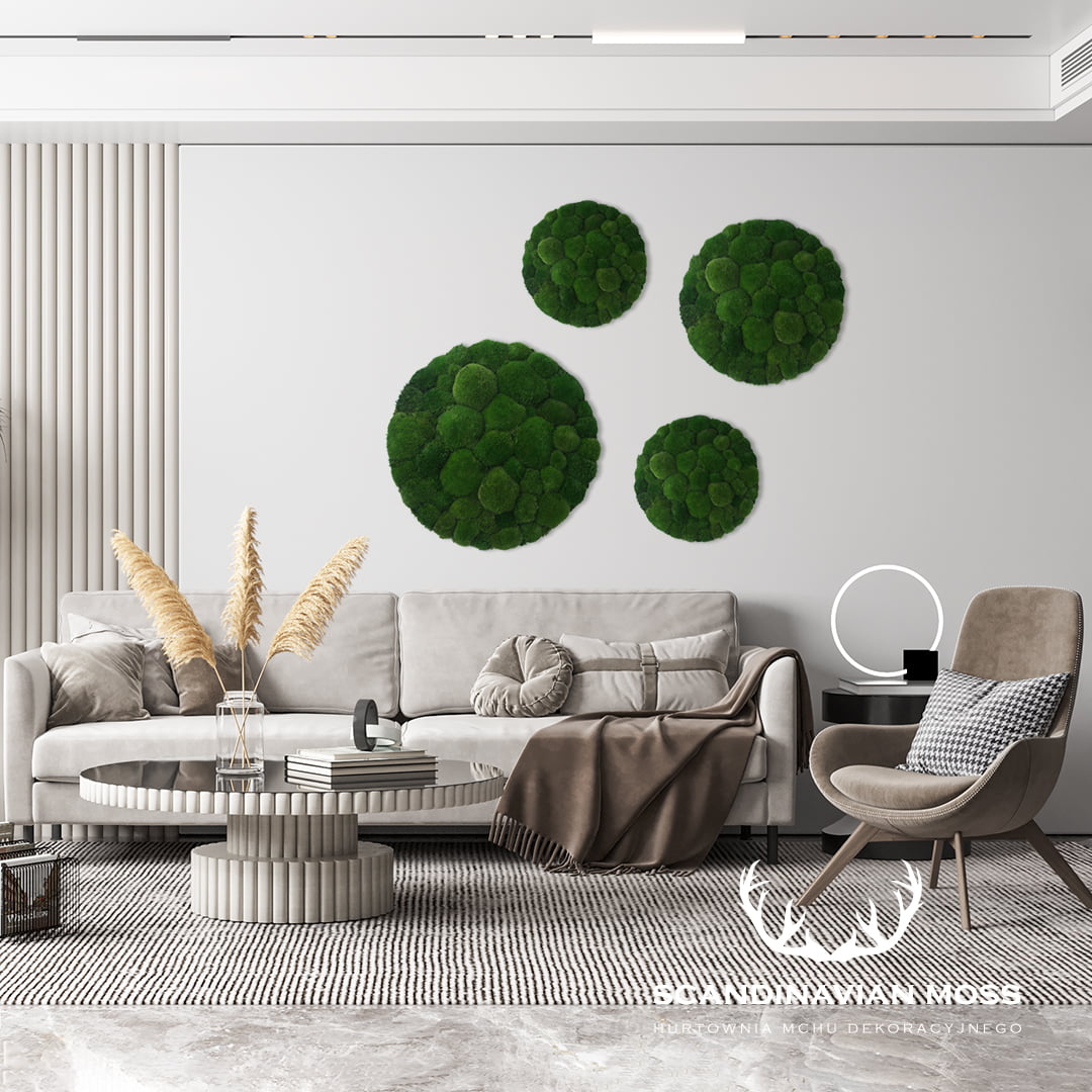 Okrągły panel dekoracyjny ze stabilizowanego mchu poduszkowego jakości premium. To jeden z najbardziej oryginalnych elementów współczesnego designu wnętrz. Jest całkowicie bezobsługowy, co oznacza, że nie wymaga żadnych zabiegów pielęgnacyjnych. Dodatkowo preparowany mech przez wiele lat zachowuje swój pierwotny kolor i strukturę. Panel przeznaczony do montażu na ścianach i sufitach.