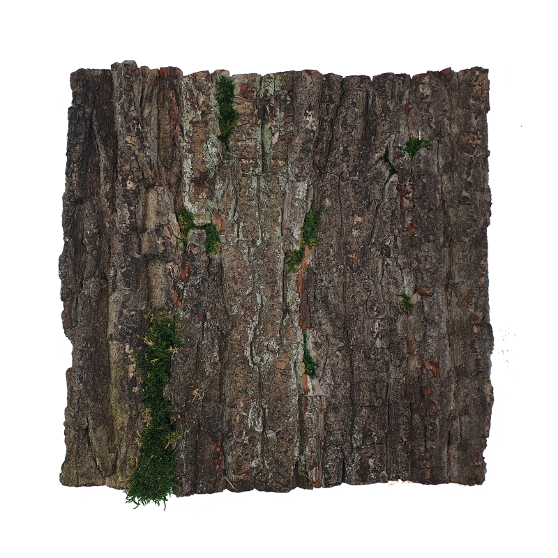 Starannie wyselekcjonowane kawałki kory trwale zamocowano na lekkiej, wilgocioodpornej płycie o wymiarach 50×50 centymetrów i grubości 0,5 centymetra. Niewielka waga płyty umożliwia łatwy i szybki montaż panelu, z kolei podwyższona odporność na wilgoć zapobiega rozwojowi pleśni. Kora ustabilizowana w glicerynie zachowuje swój wygląd i strukturę przez długi czas. Nie gnije i nie staje się siedliskiem bakterii. Panel udekorowano stabilizowanym mchem płaskim w kolorze ciemnozielonym.