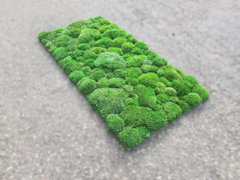Poszczególne kępki mchu przyklejono do podłoża w taki sposób, by tworzyły zwartą, jednolitą powierzchnię. Pomiędzy kępkami nie widać żadnych prześwitów ani pustych miejsc odsłaniających panel. Obrzeży panelu nie wykończono mchem, dlatego można łatwo łączyć go z innymi panelami w sposób modułowy. Taka konstrukcja umożliwia stworzenie jednolitej, zielonej ściany nawet o bardzo dużej powierzchni.