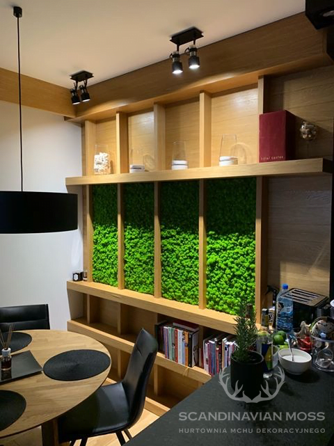 Panel z mchu chrobotka przeznaczony do samodzielnego montażu na ścianie lub suficie wewnątrz budynku to znakomity sposób, by odmienić wystrój wnętrza. Dekoracja z mchu jest uniwersalna, dlatego pasuje do wnętrz w stylu nowoczesnym, rustykalnym, skandynawskim oraz industrialnym. Imponująco wygląda w towarzystwie elementów z cegły, betonu architektonicznego, szkła, stali, ozdobnego kamienia i drewna.