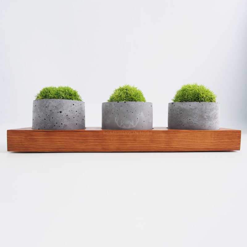 Doniczki zostały wykonane z szarego betonu architektonicznego i umieszczone na drewnianej podstawce. Niewielkie wklęśnięcia w strukturze doniczki nie są wadą produktu, ale powstają na etapie produkcji, gdy pęcherzyki powietrza dostają się do betonowej masy. Geometryczna forma dekoracji doskonale wpisuje się we współczesny design wnętrz.